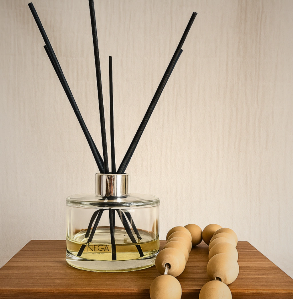 Honolulu combina la elegancia del vidrio cilíndrico con detalles modernos: tapa color plata y varillas negras que realzan cualquier rincón. Su aroma envolvente llena el ambiente de calidez y estilo, como solo NEGA sabe hacerlo.